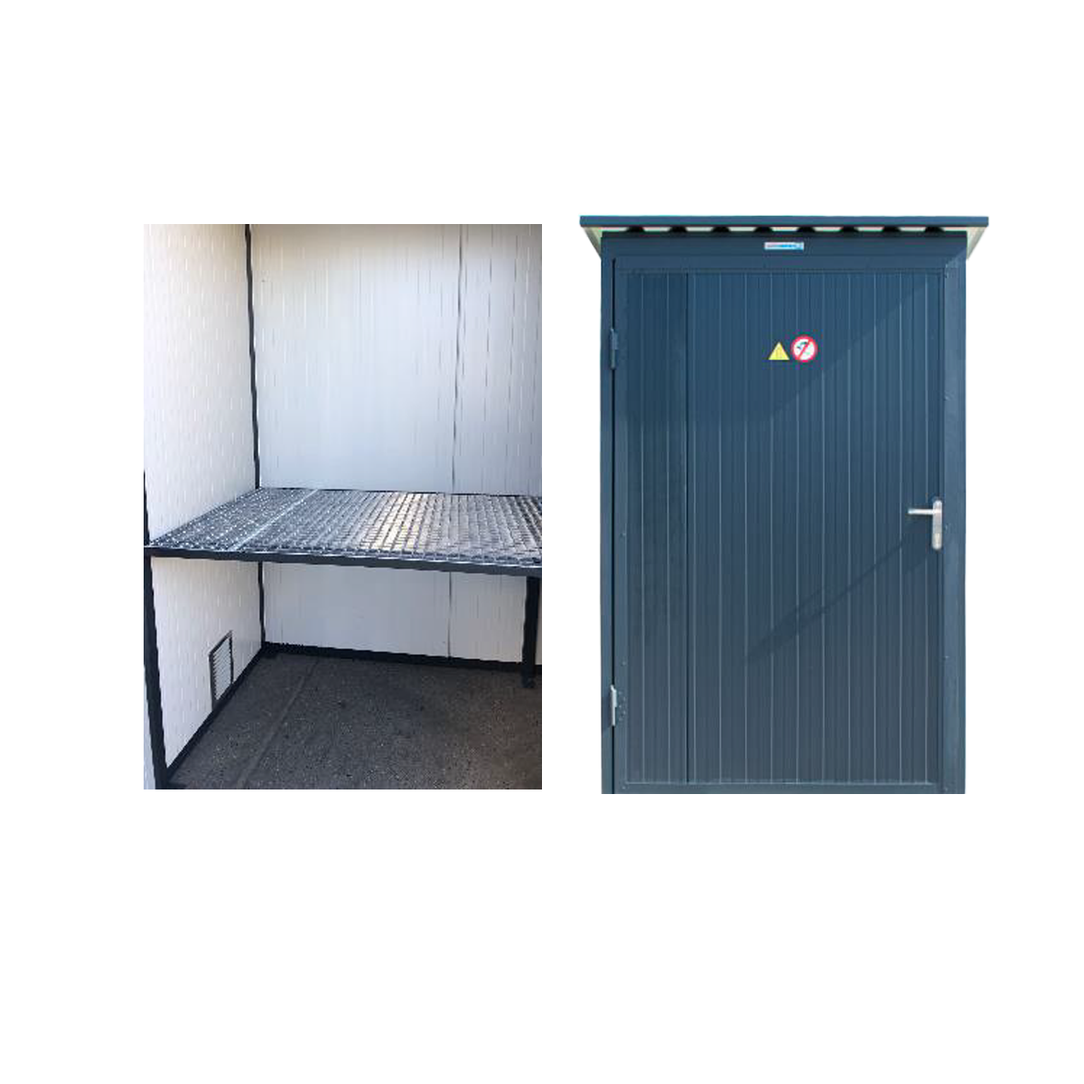 - Constructie: 3 wanden + dak uit sandwichpanelen, onbrandbare steenwol